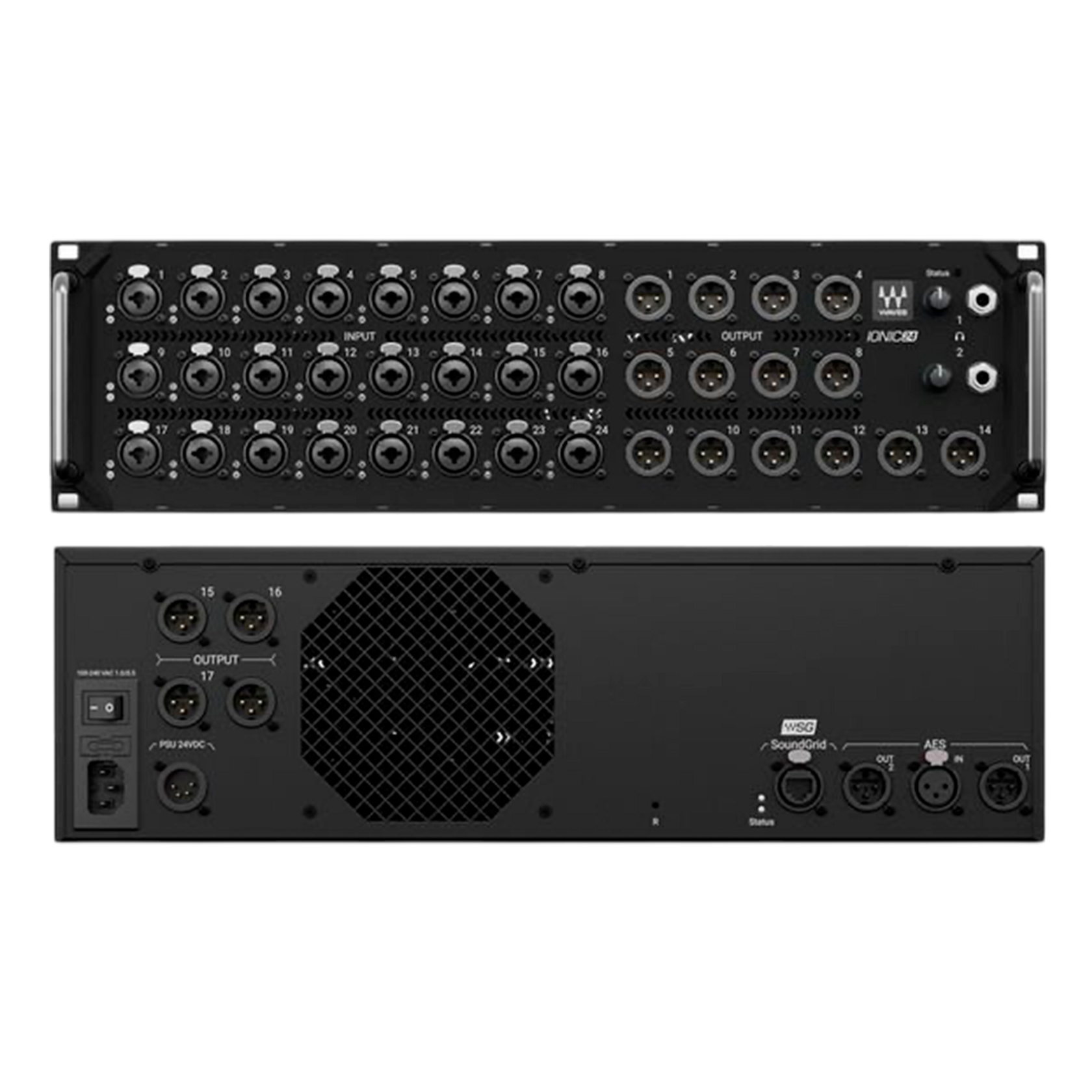 Краткое техническое описание Waves Ionic 24 Waves Ionic 24 — это цифровой рэковый stage box формата 3U, предназначенный для профессиональных живых выступлений и студийных применений в экосистеме SoundGrid. Устройство обеспечивает 24 входа и 18 аналоговых выходов, полностью интегрируясь с цифровым микшером eMotion LV1 и другими совместимыми системами . Ключевые характеристики: